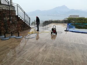 Riposto il telo si procederà ad una generale pulizia approfondita con idropulitrice dei plateatici della zona piscina o , su vostra richista, anche di tutta la casa.