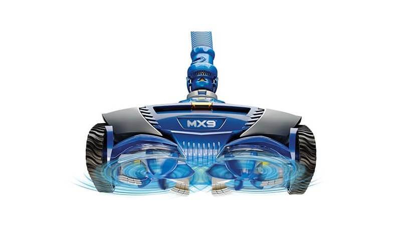 Il sistema di turbo aspirazione del pulitore Zodiac MX9 è basato su una potente turbina e due eliche periferiche d’aspirazione con spazzole che convogliano tutto lo sporco e i detriti verso la bocca di aspirazione del robot. È così garantita una pulizia ultra-efficace, anche con portate ridotte.